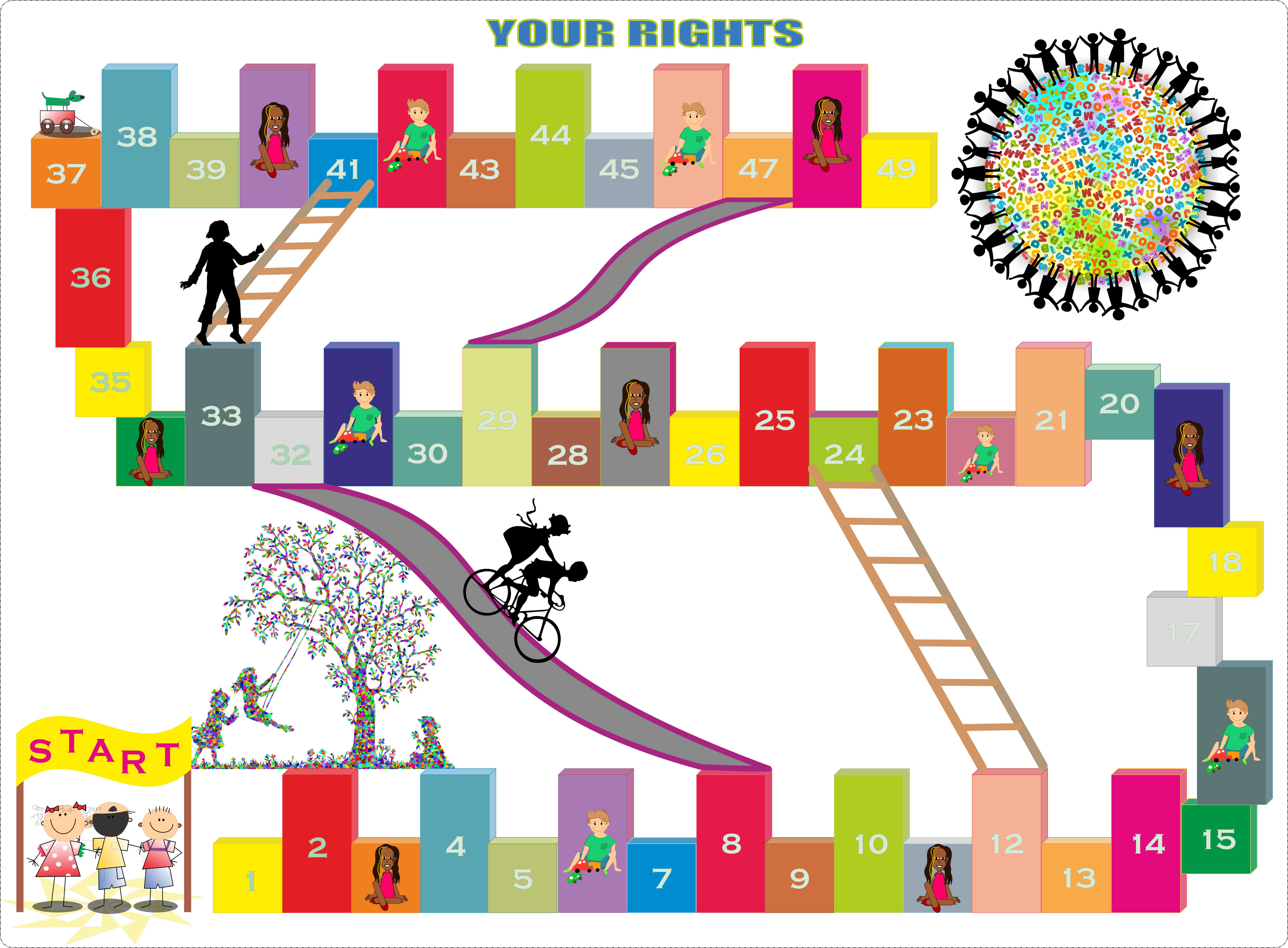 - Tablero de juego "Sus derechos" (Anexo 4) impreso en color sobre papel formato A2 (420 mm x 594 mm), no brillante de más de 200 gramos / m2, como cartón mate. Puede laminarlo, si lo desea.